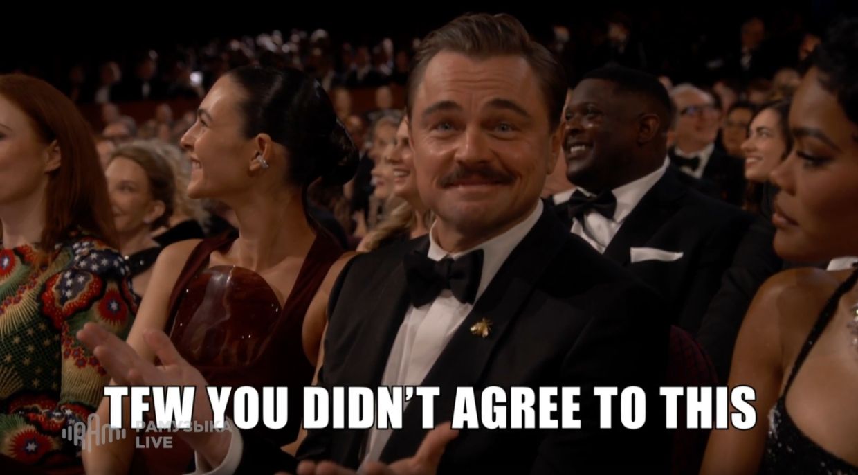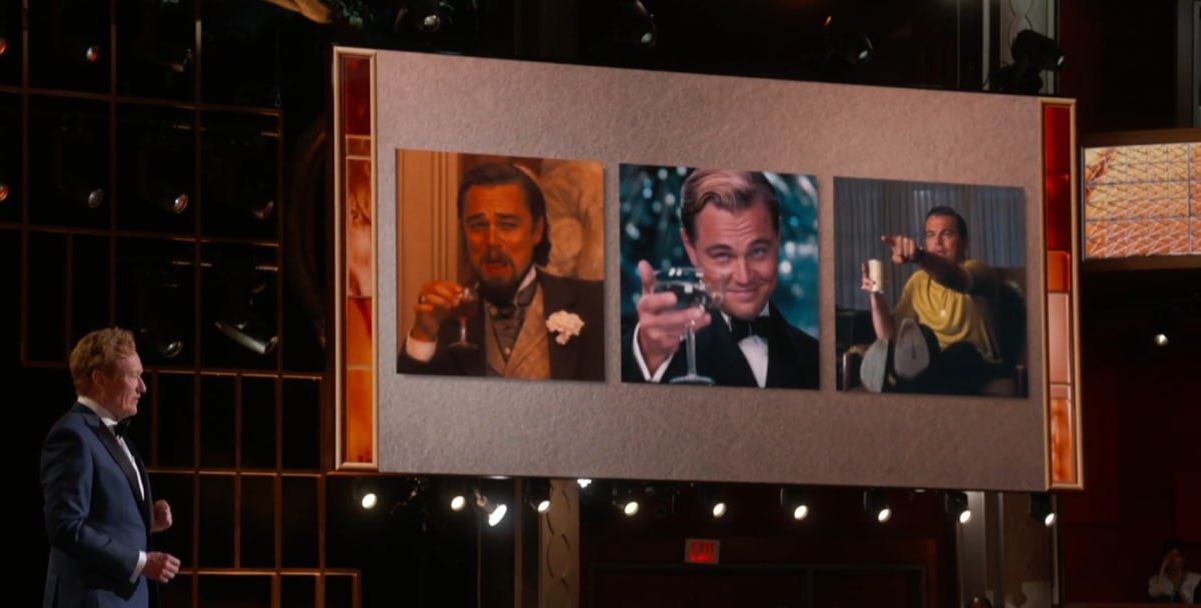 Перед этим на экране показали другие известные мемы с Ди Каприо, среди которых кадры из «Великого Гэтсби», «Однажды в Голливуде» и «Джанго освобождённый».