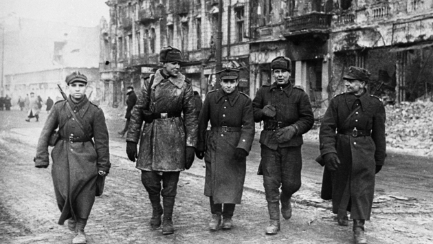 Советские и польские солдаты в городе Сандомире. 1944 год.