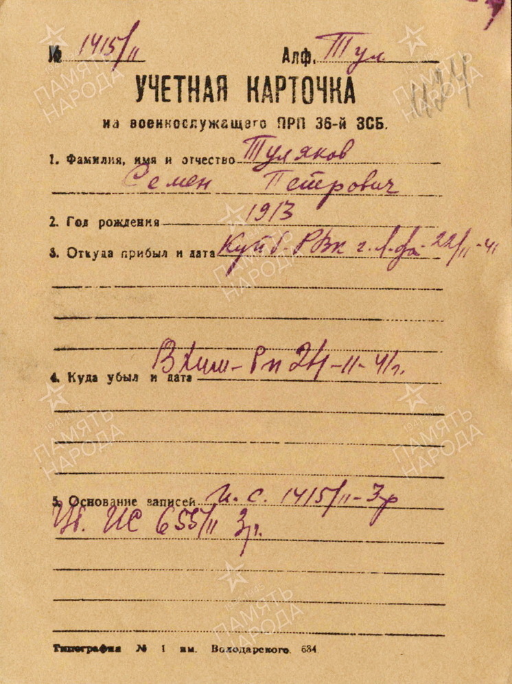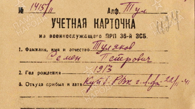 19 февраля 1942 года в ходе наступательной операции в районе Слуцкого парка на красноборском направлении боец 65-го стрелкового полка 43-й дивизии 55-й армии Туляков получил сквозное пулевое ранение в руку. В указанный период 55-я армия вела активные наступательные действия в районе посёлка Красный Бор под Тосно Ленинградской области.