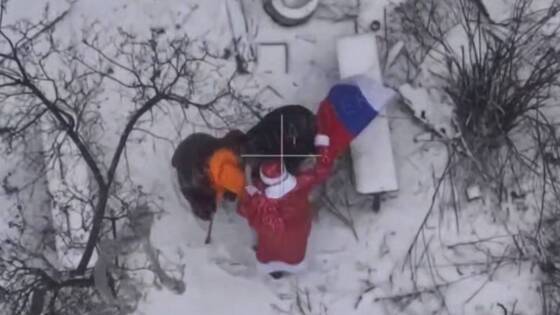 На кадрах военнослужащий в костюме Деда Мороза сначала поднимает над городом знамя своего подразделения, затем, в том числе вместе с другими военными, — флаг России.