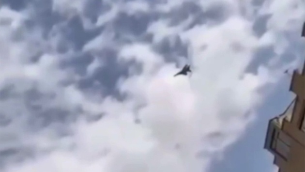 Очевидцы сняли самолет, летящий на малой высоте над городом. Кадры сопровождаются эмоциональными радостными возгласами. Вероятно, истребитель намерены применять в качестве средств ПВО для перехвата ракет.