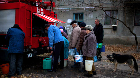Местные жители набирают воду из пожарной машины. Луганск. 2014 г