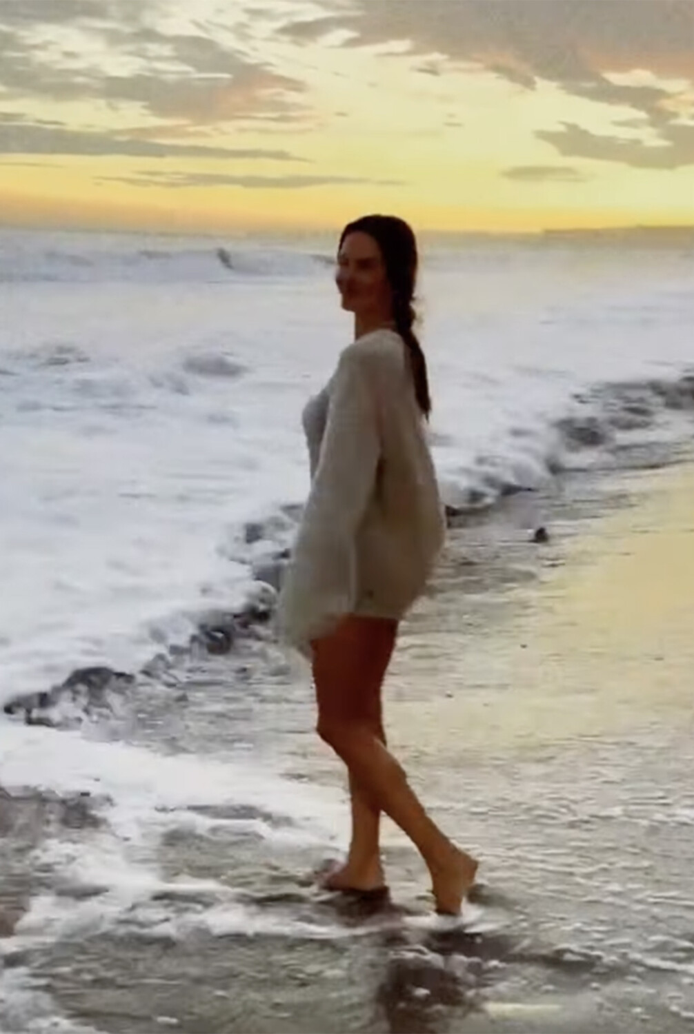 44-летняя Алессандра Амбросио в белых трусах и свитере. Волосы она распустила и отказалась от макияжа. В кадре она станцевала на берегу океана.
