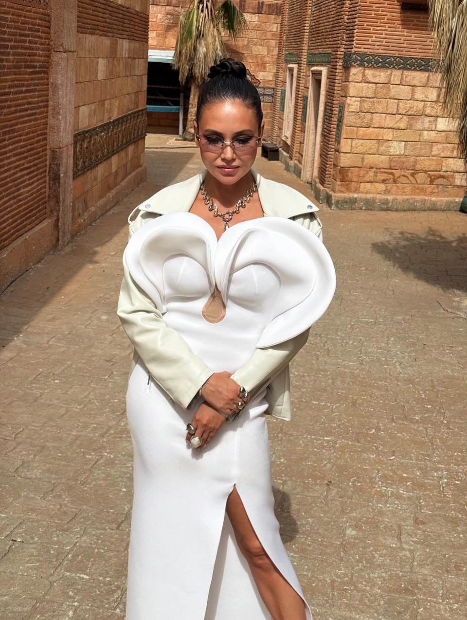 Ляйсан Утяшева позировала перед камерой в белом макси-платье с разрезом и аппликацией на лифе, которое дополнила кожаной курткой в тон. Бывшая гимнастка завершила образ очками, массивной цепью и кольцами. Знаменитости уложили волосы в высокий пучок и сделали макияж с черными стрелками. Фото были сделаны во время съемок шоу «Выжить в Стамбуле».