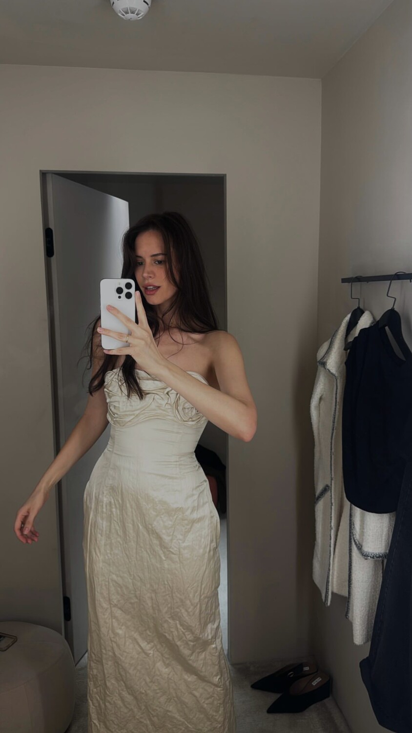 34-летняя Диана Пожарская стояла перед зеркалом в бежевом макси-платье с облегающим верхом, которое дополнила золотым кольцом. Актриса позировала с распущенными волосами и макияжем в естественном стиле в примерочной.