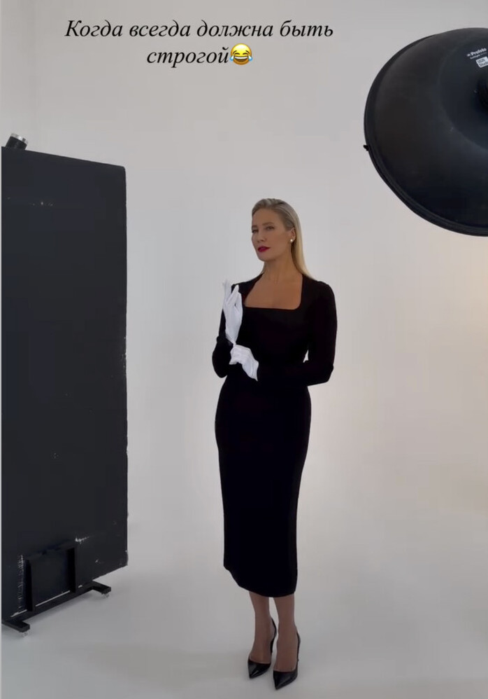 Елена Летучая позировала в черном платье с глубоким декольте. Образ дополнили туфли с острым мысом и белые перчатки. Волосы ей выпрямили и сделали макияж с красной помадой.
