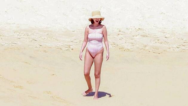 33-летнюю знаменитость заметили во время отдыха на пляже в Мексике. Ее запечатлели с разных ракурсов в слитном розовом купальнике в полоску и бежевой шляпе.