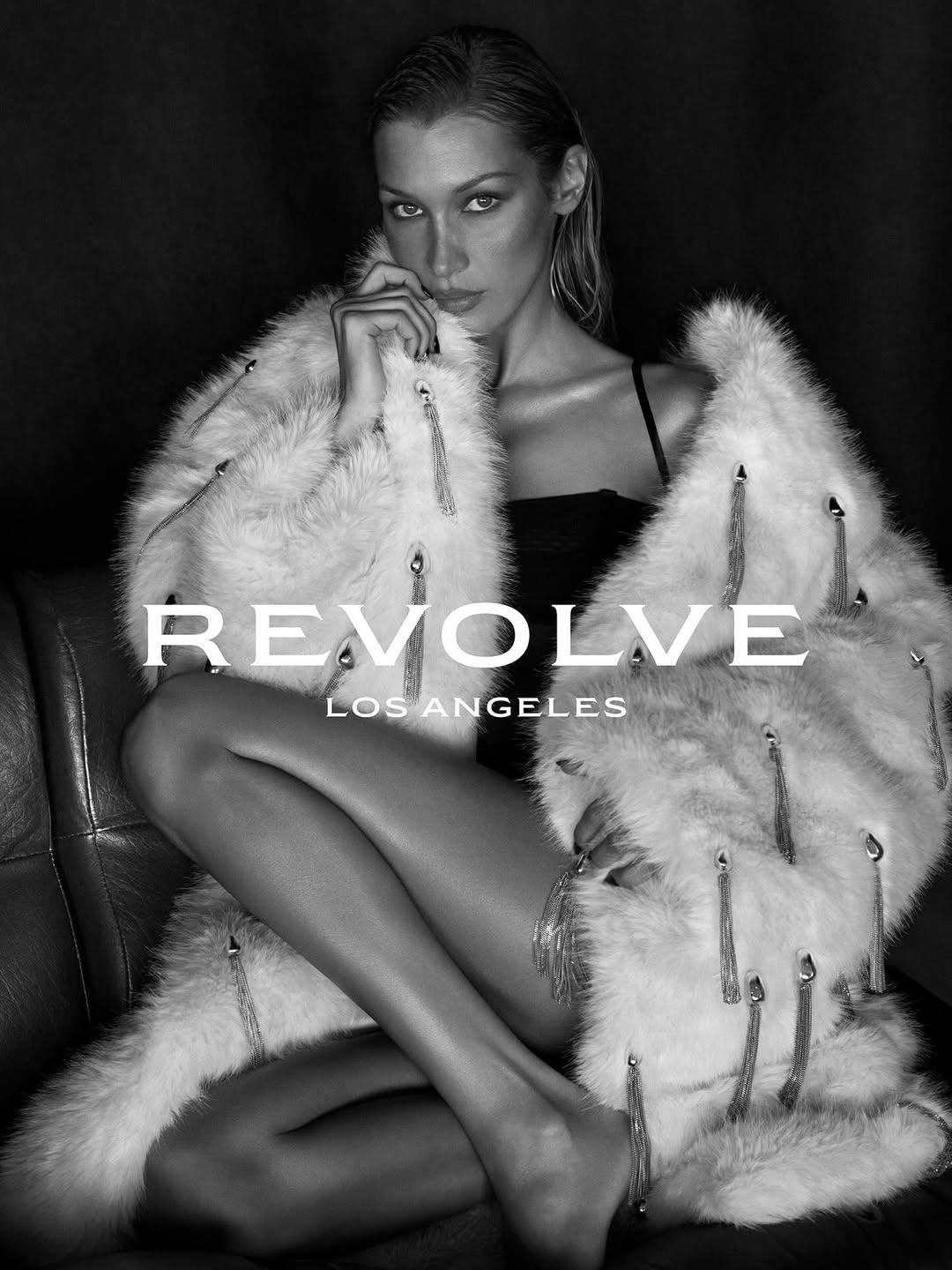 29-летняя Белла Хадид стала лицом новой коллекции бренда Revolve. На одном из кадров супермодель позировала в черном боди без штанов. Манекенщица также надела объемную шубу с кисточками. Знаменитости сделали укладку с эффектом мокрых волос и макияж.