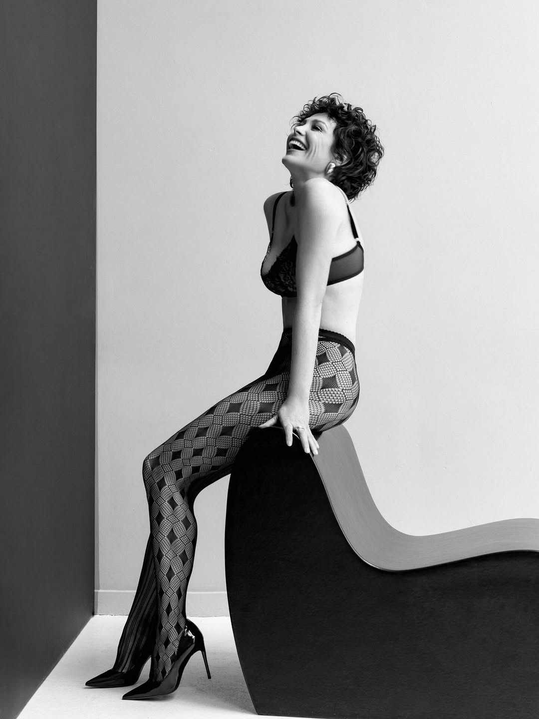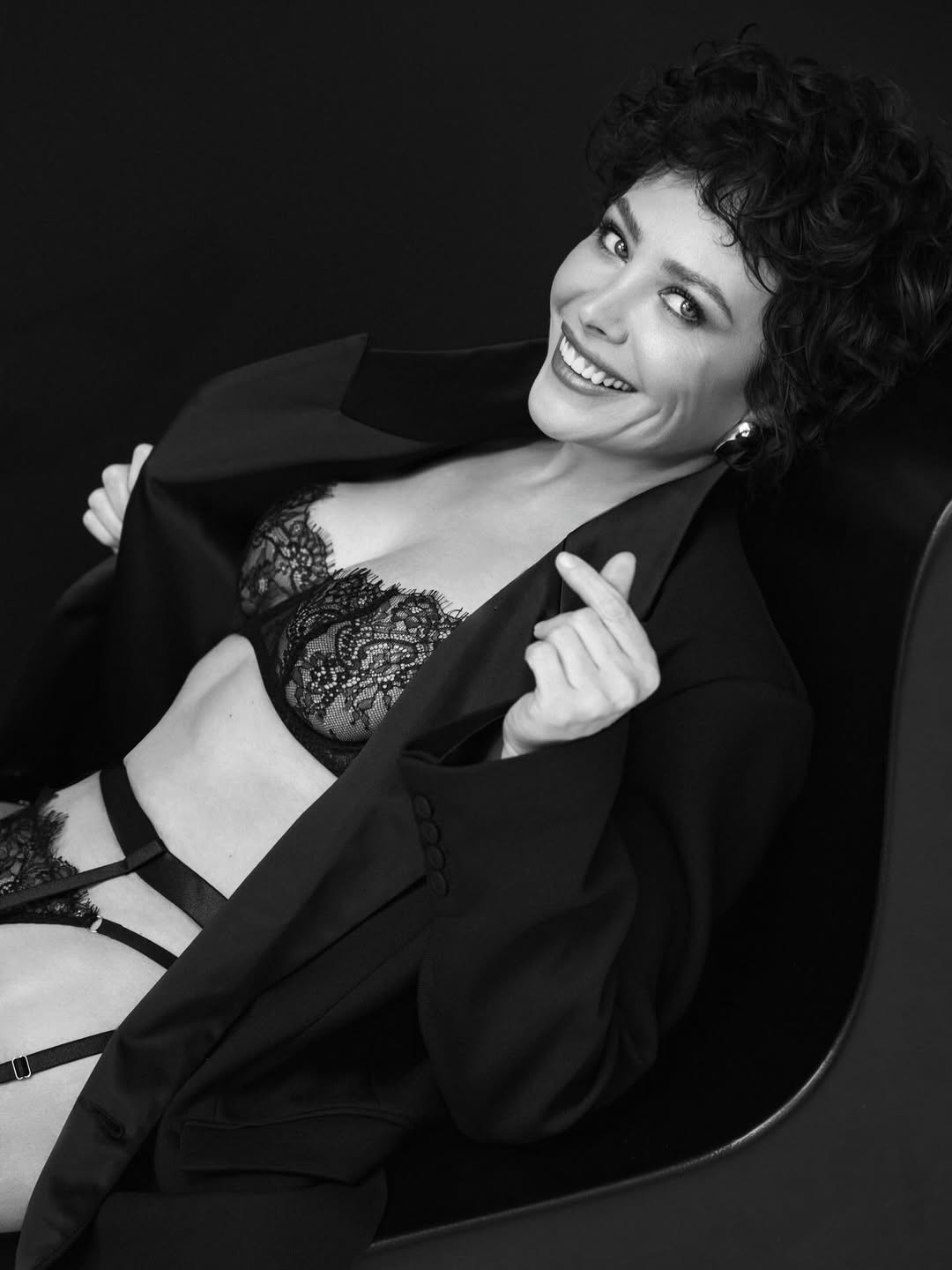 Знаменитость предстала на черно-белых кадрах в кружевном бюстгальтере и стрингах. Также она надела чулки с поясом и дополнила образ массивными блестящими серьгами.