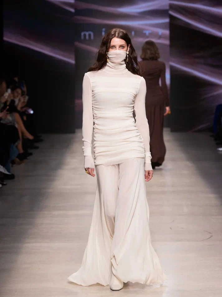 Бренд Miditi представил на Московской неделе моды коллекцию, посвященную Калининградской области. В линейку вошли 23 изделия в благородной песочной гамме — от белого до бежевого оттенка. Элегантные образы дополнили шляпы-таблетки в тандеме с фатином, создающим эффект фаты, которые стали изящным акцентом показа. Силуэты коллекции перекликаются с образами песчаных дюн. Плавные линии и мягкие формы создают ощущение естественной изменчивости, а многослойные фактуры подчеркивают движение.