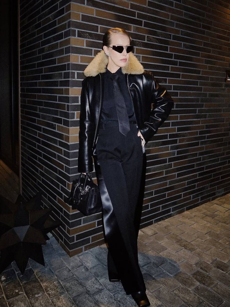 Ксения Собчак позировала в черной кожаной куртке с воротником из меха, черных брюках, рубашке и галстуке. Образ дополнила сумка от Hermes, массивные кольца, солнцезащитные очки и серьги с бриллиантами.