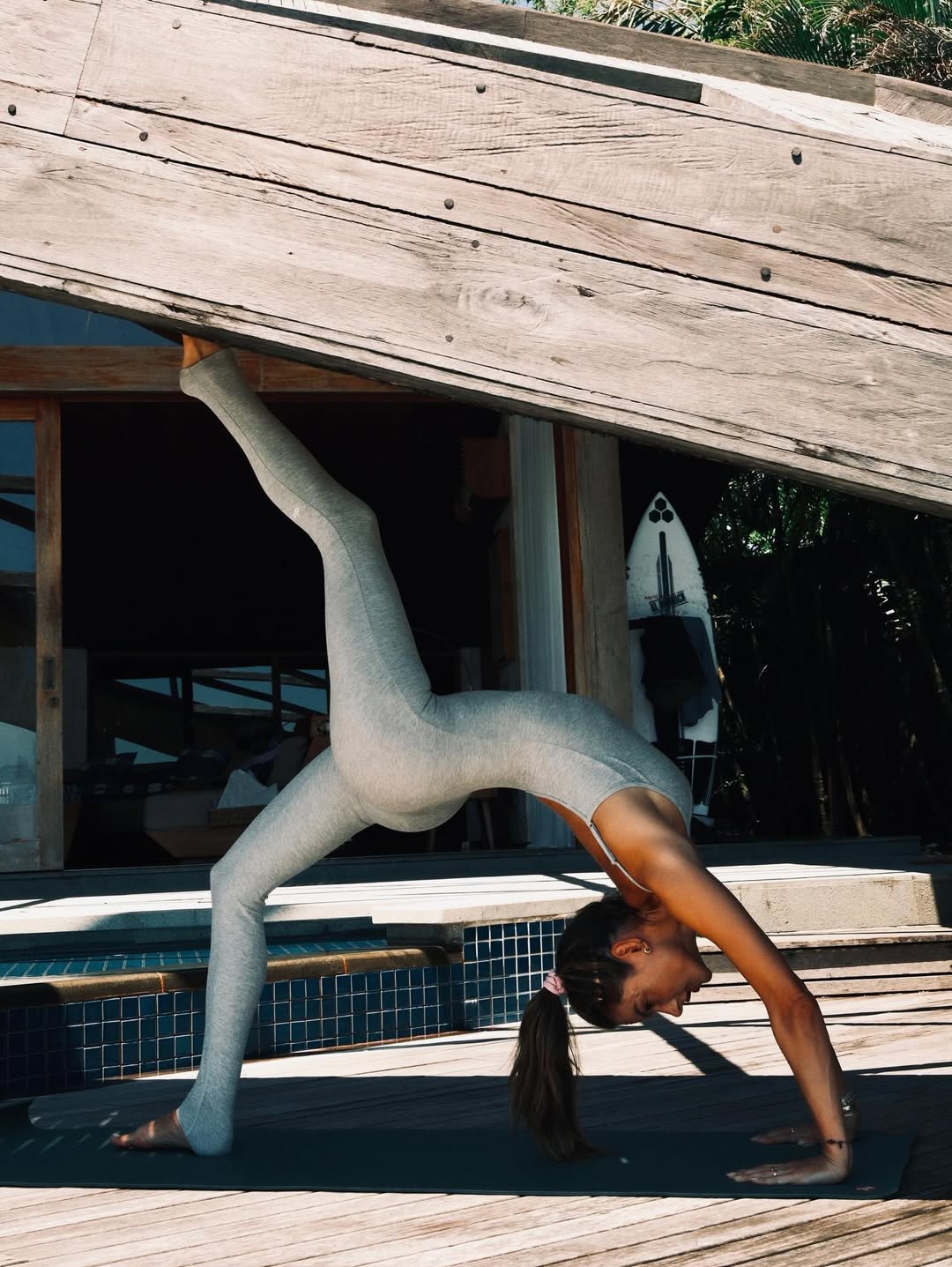 44-летняя Алессандра Амбросио позировала в облегающем сером комбинезоне с глубоким декольте. Волосы она собрала в хвост и сделала легкий макияж. Модель сделала несколько асан в йоге и показала растяжку перед камерой.
