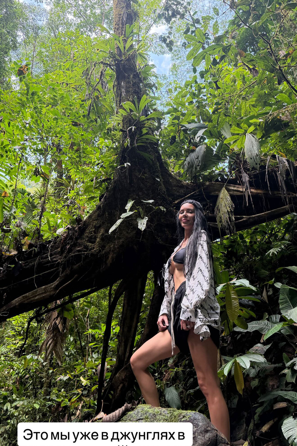 37-летняя Оксана Самойлова была запечатлена во время поездки в джунгли. Блогерша позировала перед камерой в черном ультракоротком топе, шортах и белой накидке с принтом. Знаменитость также надела кепку. Модель снялась с распущенными волосами и без макияжа на фоне деревьев.
