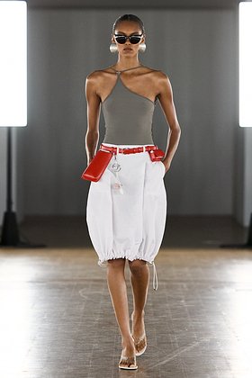 Coperni на показе весна-лето — 2026 представили лаконичный вариант юбки миди белого цвета в сочетании с облегающим топом. Акценты дизайнеры сделали на крупных серьгах и поясной красной сумке.