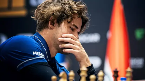 Партия между шахматистами завершилась на 29-м ходу. После этого Карлсен, уходя от игрового стола, оттолкнул камеру оператора, который последовал за ним.