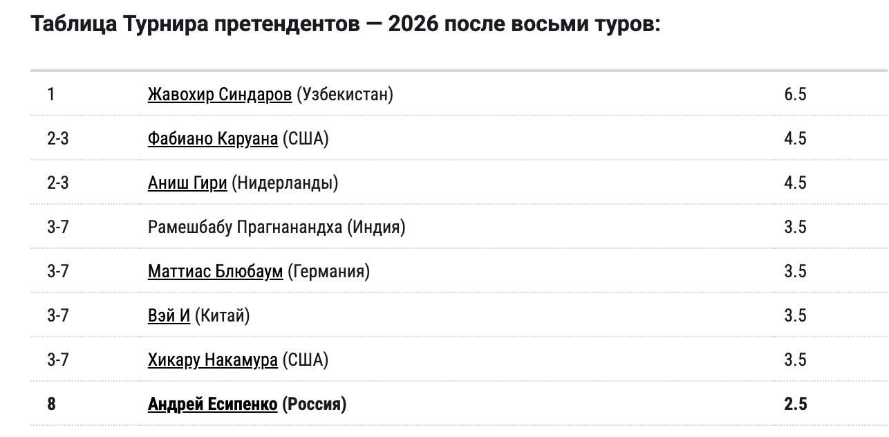 Таблица Турнира претендентов — 2026 после восьми туров:
