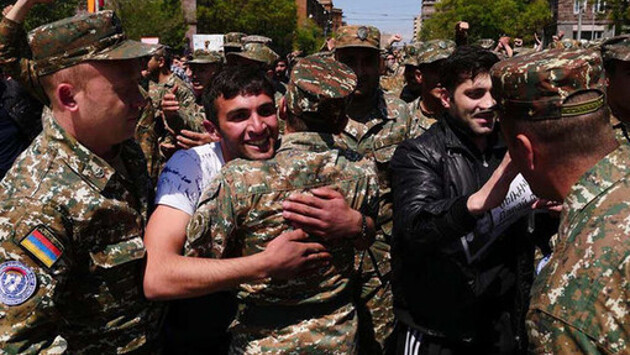 Cегодня к протестующим в Ереване присоединилась группа лиц в военной форме. Как сообщало РИА «Новости», это десятки людей в камуфляжной одежде, они не вооружены и отказываются давать комментарии представителям СМИ.