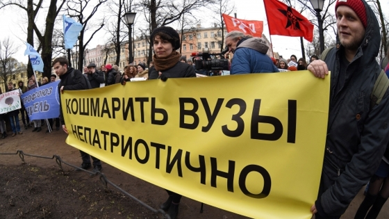 Митинг против так называемой оптимизации в сфере образования прошел 23 апреля в Санкт-Петербурге. Его участники выступили с критикой как отдельных управленческих решений в образовательной среде, так и персонально тех, кто принимает эти решения. ИА REGNUM публикует фоторепортаж о событии. Как сообщают местные СМИ, основную группу митингующих, собравшихся днем в саду Салтыкова-Щедрина в центре Северной столицы, составляли учащиеся Санкт-Петербургского издательско-полиграфического техникума. Их возмущение вызвало решение губернатора города об объединении техникума с колледжем строительной индустрии и городского хозяйства. Как сообщало издание «Петербургский дневник», в числе организаторов и участников согласованной с властями акции также были представители СПбГУ, Европейского университета, Российского государственного гидрометеорологического университета и Санкт-Петербургской художественно-промышленной академии им. Штиглица. Все эти вузы в последнее время оказывались в центре громких скандалов. Так, сотрудники и студенты СПбГУ требовали воссоздания ряда факультетов, которые были ликвидированы в ходе реорганизации университета и появления в его структуре институтов. Европейский университет оказался перед лицом полной приостановки учебного процесса из-за претензий Роскомнадзора. Кроме того, он может лишиться права использования исторического здания в центре города, поскольку комитет имущественных отношений Смольного аннулировал вузу договор аренды. А, например, Академия имени Штиглица оказалась взбудоражена из-за отставки и.о. ректора Василия Кичеджи, которая произошла, как считается, по инициативе Минобрнауки и Смольного. Кроме того, в вузе опасаются, что теперь его могут соединить с учебным заведением другого профиля, что повлечет утрату потенциала знаменитой академии. По данным «Петербургского дневника», в митинге участвовало порядка ста человек. Они требовали автономности высших и средних учебных заведений, самоуправления, прозрачности кадровой политики и возможности выбирать руководство. Помимо этого, как сообщают СМИ, участники акции выдвинули требования отставки губернатора города Георгия Полтавченко и ректора Санкт-Петербургского государственного университета Николая Кропачева.