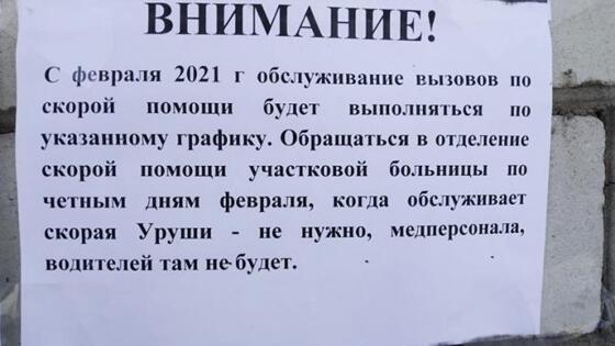 «Обслуживание вызовов по «скорой помощи будет выполняться по графику. Обращаться в отделение скорой помощи участковой больницы по чётным дням февраля, когда обслуживает скорая Уруши не нужно: медперсонала, водителей там не будет». Уруша – это название другого населённого пункта, который почти за 80 километров. А если вам поплохело не по графику, получается, просто не повезло… Минимум три часа туда-обратно по бездорожью. И не факт, что вообще кто-то из Уруши приедет.