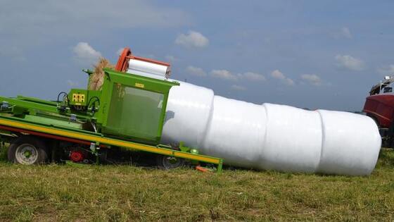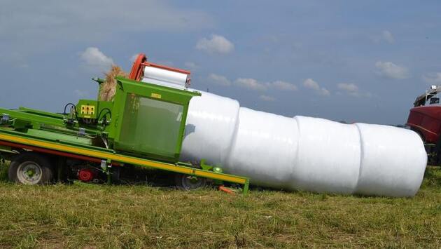 Классический вариант «Сенажа в упаковке», предполагает отдельное «закатывание» в пленку каждого рулона. В технологии «Пермской» на этапе упаковки используют скоростной упаковщик SPEEDWAY 120 — он оборачивает рулоны агрострейчем в 6-8 слоев и укладывает в «линию».