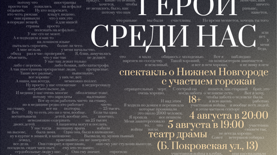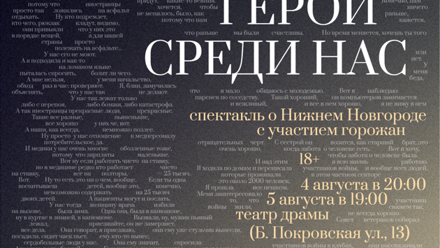Спектакль «Герои среди нас» о Нижнем Новгороде с участием горожан можно будет увидеть 4 августа в 20:00 и 5 августа в 19:00 в Нижегородском театре драмы. Билеты можно приобрести на сайте nn.kassir.ru: nn.kassir.ru/teatr/geroi-sredi-nas-spektakl#873055. Возрастная категория спектакля:18+.