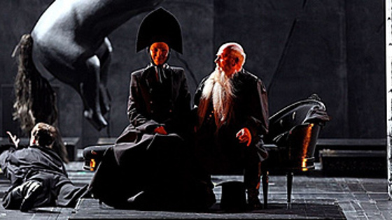 На сцене Театра им. Моссовета можно посмотреть "Грозу" режиссера Андрея Могучева — готическую и мрачную интерпретацию пьесы Островского. Весь мир спектакля будто плоский, герои все в черном (кроме Катерины в алом наряде), их окружают зловещие узоры и орнаменты в русском народном духе, но существуют они лишь на авансцене. Позади них — пропасть, с мерцающими молниями и надвигающейся бурей.