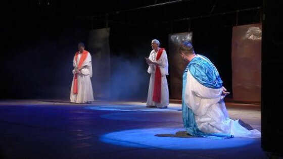 Открылась фестивальная программа сценической версией самого знаменитого булгаковского романа «Мастер и Маргарита» в исполнении московского «Театра на Юго-Западе». Постановке легендарного режиссера Валерия Беляковича, который и пензенский драматический называл своим родным, - 30 лет. Евгений Бакалов, играющий в столице роль Мастера, в пензенской версии был Иваном Бездомным. «МаскерадЪ» - некий экзамен для актеров.