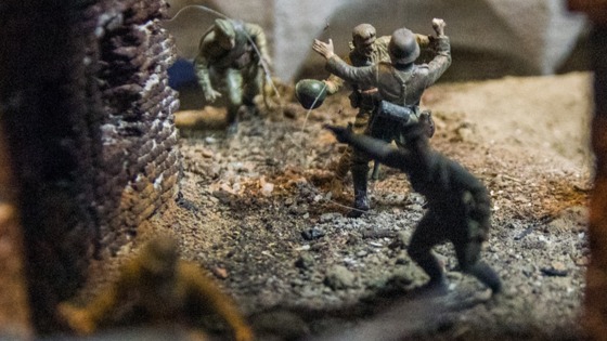 Недавно мастер увлекся библейскими мотивами, но самая большая работа — все же о войне. Диорама бой у Тереспольских ворот посвящена героям Брестской крепости. Крошечные реалистичные фигурки советских и нацистских солдат поражают деталями. На лицах застыли гримасы боли, а с разрушенной башни, кажется, еще пару секунд — и осыпется кирпич. Болото, мох, черный дымок, танки, штыки оружия не толще швейной иглы: на всю работу у Сергея ушло полгода.