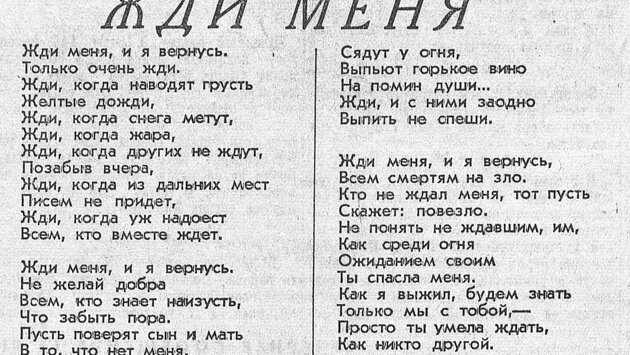 Константин Симонов говорил, что это стихотворение обязательно бы кто-то написал, даже если и не он: в нем была жизненная необходимость. Строки «Жди меня, и я вернусь…» переписывали тысячи солдат и отправляли по всей стране.