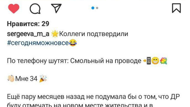 «Еще пару месяцев назад не подумала бы о том, что ДР буду отмечать на новом месте жительства и в должности советника вице-губернатора Санкт-Петербурга. Шеф сегодня, произнося пожелания, сказал, что я самый молодой советник. А когда-то была самым молодым депутатом, самым молодым помощником, самым молодым руководителем, самым молодым телевизионным ведущим», — указала Сергеева на своей странице в соцсети.
