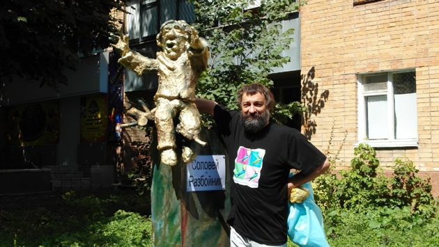 Как ни относись лично к Радину, его произведениям и акциям, «АЯ» остаётся одним из главных центров притяжения культурной жизни Курска. Причём за народной, максимально демократичной, почти лубочной формой скрывается большой Мастер, галерист, который в самые непростые годы помог множеству коллег выставить и продать свои произведения, заработав тем самым на жизнь и дальнейшее творчество. Совсем скоро – 9 августа состоится празднование Общепланетарного Дня художника – ещё одного детища Олега Радина, придуманного через два года после создания галереи. В этот день возле небольшого здания на улице Кати Зеленко, где расположена галерея «АЯ», будет, как всегда, шумно и весело. И обязательно на пару дней появится новый памятник. Какой именно? Это всегда становится известно только в момент его открытия. Накануне одного праздника и в преддверии осеннего юбилея наш корреспондент встретилась с Мастером, чтобы вспомнить самые яркие памятники и эпизоды славной истории галереи «АЯ». Я – бутафор! Из двадцати одного памятника, открытого в разные годы в День художника, сохранились немногие. Большинство из них подарены, потеряны или же перемонтированы. А памятник Борщу из натуральных продуктов, установленный в прошлом году, просто-напросто сгнил… – Поскольку я работал в театре, то кто я есть по сути? Бутафор, декоратор, – сверкает зубами сквозь густую бороду Олег Радин. – Я в театре столько всякого поналепил… Театр из меня никуда не ушёл, и мой каждый день художника – это, скажем так, продолжение моей работы в театре. Потому что всегда новый памятник – это продолжение тех декораций плюс музыкальное сопровождение, всё вместе – какое-то шоу. С одной оговоркой: раньше такое у нас не было распространено. Я устраивал первые театрализованные праздничные шоу в Курске. Это уже потом начали магазины всякие лотереи проводить, ну и так далее. Но тогда это было ново. Народ удивлялся. Знакомые как-то рассказывали, что в те годы, почти тридцать лет назад, отдыхая на пляже в Болгарии, случайно увидели передачу по интервидению, где на весь мир показывали «АЯ». Было приятно. Традиция устанавливать памятники в день праздника появилась не сразу – только в начале нулевых годов. Арт-объекты владелец галереи изготавливает самолично. Что только не было воздвигнуто на постамент за эти годы! Памятник Вдохновению, памятник группе «Led Zeppelin» ко дню рождения её солиста Роберта Планта, Золотой Ключик ЖКХ, Всем памятникам памятник в форме зеркального куба, создание которого было приурочено к выходу Курска на второе место в мире по количеству памятников… Разумеется, по версии Радина. В общем, есть что вспомнить и о чём рассказать. Соловей простоял всего неделю Самым легендарным своим произведением Олег Радин считает памятник Соловью сущему. Он был создан из подручных средств – дерева, монтажной пены, пластилина, папье-маше, бронзовой краски и много из ещё чего попавшегося под руку. В статую был встроен фонтанчик, из которого била струйка воды. – Соловей простоял почти неделю, – рассказывает художник. – Потом в одну ночь какие-то варвары-вандалы его свалили, разодрали на части – это была вообще немыслимая история. Приехала съёмочная группа канала НТВ из Воронежа. Они сняли и показали сюжет об этом на всю Россию. Репортаж увидел друг Радина, работавший в крупной московской
