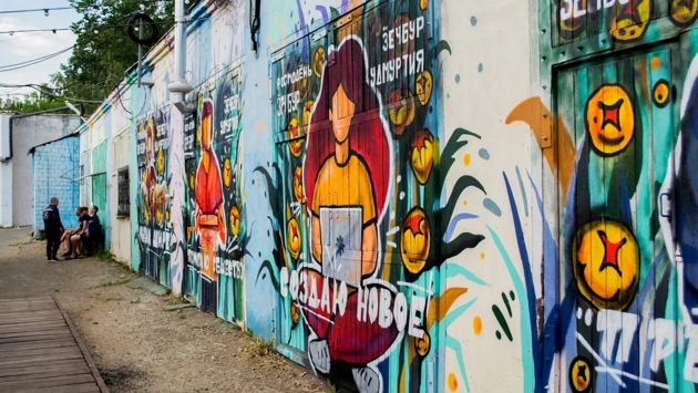 Ижевск Удмуртия. В Ижевске фасад здания в Летнем саду украсили 4 новых граффити. Об том сообщает молодежный центр Удмуртии в соцсети «ВКонтакте».