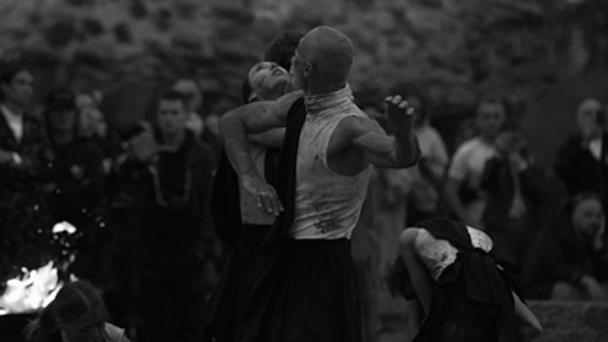 От ворот заповедника, где проверяют билеты, люди идут пешком по неширокой дороге, пока не подходят к древним мощным ступеням — каждая почти по колено, путь к храму не должен быть легким. Время спектакля специально назначено так, чтобы солнце село ровно в момент представления, поэтому возвышающиеся далее колонны с резными капителями в закатных сумерках выглядят особенно внушительно. У колонн поставлены несколько стульев, но основная масса зрителей смотрит полуторачасовой спектакль на ногах — это и удобнее, всегда можно подойти с другой стороны, взглянуть с другого ракурса. На месте, где раньше располагалось внутренее пространство храма, выступили артисты. В нем много живого огня — подставки, на которых горят натуральные костры, рядом факелы, ближе всего к зрителям — свечи. Меж этих огней стоят, двигаются, чуть колышутся и вдруг сцепляются в единоборстве восемь артистов. Девятая танцовщица, вся в черном, долго сидит среди горящих свечей. Вероятно, это плакальщица (голос настоящей армянской плакальщицы используется в фонограмме вместе с электронной музыкой и шумом человеческого дыхания); остальные восемь человек — участники поминального обряда.