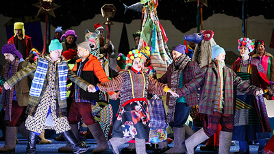 Младшие школьники, приведенные безжалостными родителями на вечерний спектакль, длящийся больше трех часов, радуются ему не меньше родителей, вспоминающих детство. У Павловича все происходит не в аутентичном украинском селе эпохи Гоголя, а в некоторой сказочной реальности, где перемешаны все времена. За утопающими в снегу домами видны опоры высоковольтных линий, Бес (Дмитрий Стародубов) ходит с тростью, напоминающей световой меч, а Солоха (фантастическое меццо Вера Позолотина) решительно забрасывает мусорные мешки к чужой хате — а вместе с тем масса народа наряжена в те яркие, разноцветные, рукотворные наряды, что вовсе исчезли из обихода в ХХ веке — века массового швейного производства. Это не какое-нибудь перенесение в наши дни — никто не достает из кармана мобильные телефоны, и в окошках домов не светятся телевизоры. Это сплетение времен, в том числе совершенно мифических, — и мамонты там тоже есть, они спокойно шествуют по экрану-заднику.