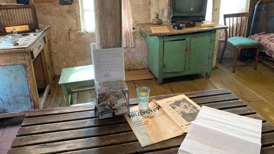 "Дом Михаила Ивановича производил страшное впечатление. Крыша местами провалилась, оголив неровные темные балки. Стены были небрежно обиты фанерой... В комнате хозяина стоял запах прокисшей еды... Над столом я увидел цветной портрет Мао из "Огонька". Рядом широко улыбался Гагарин..."