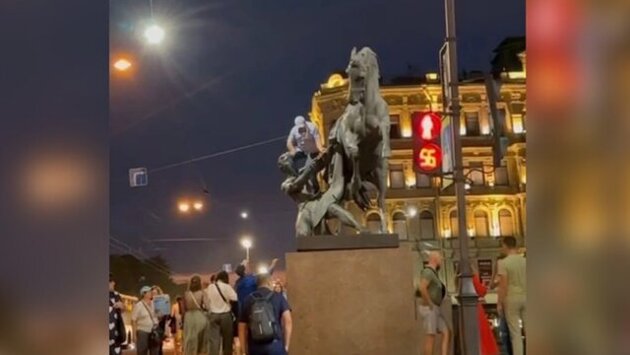 В Санкт-Петербурге мужчина устроил фотосессию, забравшись на коня на Аничковом мосту