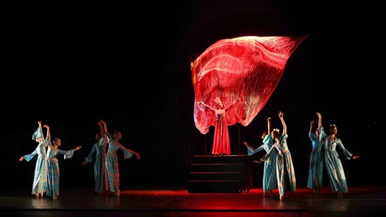 Мелодия задает строгий монотонный ритм, и танцовщики начинают двигаться в нем - сначала одними ладонями, плечами, руками. Вместе с ними двигается и ткань, словно песочные барханы. Сцена, обрамленная золотом и красным бархатом, обретает очертания бескрайней пустыни, в которой почти теряются силуэты артистов.