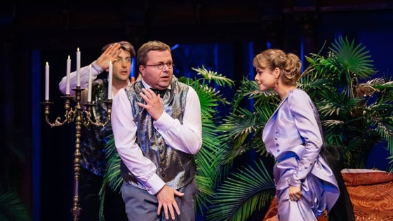 Островский - отличный повод, чтобы поиграть в "старомодный" театр с турнюрами и тяжелыми бархатными занавесами. Как говорит режиссер, ему хотелось, чтобы спектакль был праздником, приносящим удовольствие. Поэтому сценография оказалась щедрой на находки и обстановку. Пространство сцены решили необычно - альков, где главный герой Аполлон Окоемов (Родион Вьюшкин) уединяется со своими пассиями, устроили прямо в зрительном зале слева от авансцены. В "мастерской" Окоемова все на своих местах - покрывало и обои с цветочно-пасторальным орнаментом и златоголовые амурчики. Верх безвкусицы, которую Окоемов оправдывает, - мол, ума-то нет, главное богатство - красота, кроме как очаровывать женщин ничего он не умеет: "В постели я находчив и трудолюбив. Меня любят женщины".