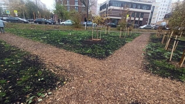 Еще одной особенностью данного сквера являются пешеходные дорожки, сделанные из щепы: сквозь нее будет уходить вода, которая стекает со склона в низину, где расположен сквер.