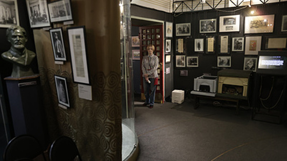 Среди бесчисленных афиш и макетов выделяются очки с темными стеклами — оказывается, их носил Михаил Булгаков. "Очки — далеко не самые черные, у него бывали и чернее", — говорит Мария Полканова. Для писателя они являлись не аксессуаром, а необходимостью — у Булгакова были частые мигрени и нарушение зрения, которое проявлялось в светобоязни: он плохо воспринимал и искусственный, и дневной свет, а работать предпочитал при свечах. Как напоминание рядом стоят подсвечник и чернильница.