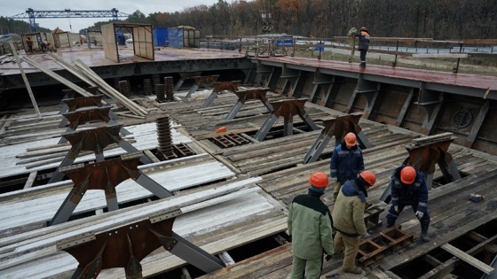 Одновременно со сборкой пролетных строений рабочие обустраивают четырехполосную проезжую часть - продолжается гидроизоляция, монтируются цоколи для мачт освещения, прокладываются кабельные мосты и выполняются другие технологические операции. Вся эта работа синхронизирована непосредственно с этапом финальной надвижки.