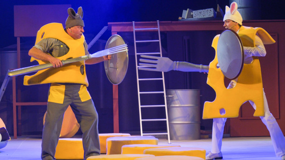 Тому, кто любит сыр, лучше поселиться на сыроварне. Но что делать, если с такими же хвостатыми любителями брынзы и пармезана возникла вражда? Об этом спектакль «Все мыши любят сыр» по пьесе венгерского писателя Дьюлы Урбана, премьера которого состоялась в Курском драматическом театре. Главные герои – две мышиные семьи, которые никак не хотят жить в мире. А вот дети подружились и мечтают, чтобы родители стали друг к другу добрее. Удастся ли это? Об этом зрители узнают, досмотрев до конца новый спектакль. Он получился ярким, с сюрпризами и спецэффектами. Почувствовать мир героев зрителям помогают красивые арии, динамичные танцы, пластические композиции. «Все мыши любят сыр» – уже 17-я режиссёрская работа одного из ведущих актёров Курского драматического театра заслуженного артиста России Александра Швачунова. Но только вторая его постановка для детей. Несколько лет назад юные зрители с восторгом приняли «Похищение Джонни». Спектакль уже несколько лет не сходит со сцены. «Все мыши любят сыр» – новый успех у самых юных и самых объективных зрителей. У спектакля был долгий путь на сцену. – Ещё четыре года назад Юрий Валерьевич Бурэ предложил мне поставить спектакль по пьесе Дьюлы Урбана, – рассказывает Швачунов. – Пьеса мне очень понравилась. Ведь это история Ромео и Джульетты с хорошим финалом, рассказанная другим языком – для детей. Здесь побеждают любовь и доброта. Я был тут же готов приступить к работе, но пьеса всё откладывалась – из-за пандемии. Почти сразу я определился с исполнителями главных ролей. В спектакле драматические артисты танцуют и исполняют арии. – Мы решили, что музыка в спектакле должна быть очень красивой, потому взяли хиты, которые дети хорошо знают по мультфильмам, – поясняет режиссёр. – Стихи написала актриса Кристина Крыженевская. Кристина – поэт, и её стихи звучат в спектакле «Школа жён». Надеюсь, мы ещё не раз услышим их в наших постановках. В спектакле несколько хореографических композиций, в финале герои исполняют современный танец с элементами рэпа. Режиссёр по пластике – заслуженная артистка России Галина Халецкая. – Мы старались создать хореографию такой, чтобы дети смогли легко её запомнить, чтобы движения хотелось повторять, – говорит Галина Николаевна. Галина Халецкая очень любит животных. Кстати, в отличие от многих женщин мышей она не боится. – Среди моих четвероногих питомцев были и грызуны, – улыбается она. – Когда младшему сыну исполнился год, бабушка подарила ему двух симпатичных толстяков – белых мышей. Мы их обожали. Я люблю всех животных. С опаской отношусь разве что к змеям. Учитывая тему и специфику постановки, многие декорации выполнены в форме сыра. В спектакле зрители услышат названия чуть ли не всех его сортов! Работы декоратора Елены Бажёновой зрители могли видеть практически во всех спектаклях курского театра. Тем не менее «Все мыши любят сыр» – её дебют. Здесь она впервые выступает как художник-постановщик. Перед художником ставилась задача: декорации должны быть максимально функциональными. Бажёнова с ней справилась. Например, зрителей ждут забавные бои: старшие мыши фехтуют огромными вилками, а в качестве доспехов используют кусочки рокфора. – Когда я задумывал этот спектакль, увидел необыкновенный номер одной известной фигуристки. Она проводила рукой по платью, и 