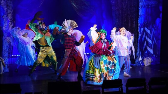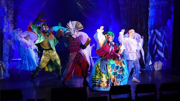 К "Горбунку" как правило обращаются в самом нежном возрасте — простой, но сочный язык Ершова, не перегруженный архаизмами, но со значительными элементами старины, приучающими ребенка к своеобразию и выразительным возможностям родного языка, занимательный сюжет, полный чудес и диковинок, позитивный нравоучительный финал — все здесь словно создано для воспитания и познания через игру, сказку, запоминающиеся и часто необычные образы. Эти рифмы и выражения живут потом с нами всю жизнь, всплывая из памяти к месту и не очень, однако для подавляющего большинства сказ про удачливого Ивана-дурака и его верного друга Горбунка прочно ассоциируется с миром детства — и напрасно: сказка по сути поучительна и актуальна для читателя любого возраста, несмотря на свою потешно-скоморошечью форму. Фото предоставлено автором Именно этот пласт сказки почувствовали и уловили создатели нового спектакля в МДТЭ — и через воссоздание на сцене ярмарочного балагана решили познакомить малышей уже нового поколения, кого в силу специфики нашей эпохи уже не так просто засадить за книжку и заставить просто слушать текст, с бессмертным творением Ершова, а взрослым решили напомнить о прекрасной сказке-морали через новую музыкально-театральную форму подачи материала. В итоге родился полноценный мюзикл — ёмкий и компактный, в одном акте, менее полутора часов хронометража, не утомительный для самой малолетней аудитории, полный ярких образов и драйвового действа. Музыку написал основатель и бессменный руководитель МДТЭ композитор Валентин Овсянников — он опирался на русский мелос и фольклор с его переменными неклассическими размерами, своеобразными ритмами, простой, но выразительной напевностью: ведь сказка Ершова очень русская по своему мышлению и образности, значит и музыкальное ее преломление должно неизбежно и обязательно нести черты этнографического театра. Но "упаковано" все это в современный формат эстрады — с ее открытой и яркой подачей материала, местами прямолинейной и без особых нюансов, с господством метро-ритмической жесткой сетки, с повышенной звучностью. На самом деле эстрадная подача в "Горбунке" абсолютно к месту — ведь эстрада корнями в том самом балаганно-скоморошечьем площадном народном театре-представлении, из него она по сути когда-то и выросла. Поэтому музыкальный лубок, оформленный в современные тембры и ритмы, оказывается тут абсолютно гармоничным и естественным — а сама история получает словно дополнительное измерение. Фото предоставлено автором Автор стихов Алина Байбанова частично использовала тексты Ершова, но многое переосмыслила и додумала сама. Кроме того появились прозаические вставки "от рассказчика" между картинами, которые озвучивают для публики развеселые ухари-скоморошины. Сюжет Ершова в целом оставлен неприкосновенным, есть небольшие сокращения и упрощения, но в целом канва знакома всем. Самая заметная новация — корректировка эпизода с "чудо-юдо рыбой кит": вместо обширного поселения на хребте у гигантской рыбины главный герой вместе с публикой оказывается в подводном царстве с разгулом океанских диковинных обитателей — явная перекличка с другой хрестоматийной русской сказкой, с Садко. Небольшая сцена МДТЭ использована постановщиками разумно: она не загромождена, фактически весь реквизит огра