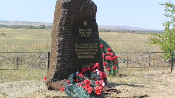 В Городищенском районе утвердили предмет охраны памятника истории «Место гибели санинструктора Королевой М. В. /Гули/», который находится недалеко от хутора Паньшино. Как сообщили в регкомитете государственной охраны объектов культурного наследия, защите подлежит памятный знак из натурального камня с рельефными изображениями лавровой ветви и пятиконечной звезды, а также текстом мемориальной надписи. Кроме того, в перечень объектов вошел холм высотой 56,8 м с природным рельефом и характерным историческим ландшафтом периода Сталинградской битвы, сохранившим видимые следы ожесточенных боев. Отметим, что установление предмета охраны позволит провести весь необходимый перечень работ по сохранению памятного места. По данным специалистов, Марионелла Владимировна (Гуля) Королева родилась 9 сентября 1922 года. С самого детства она активно снималась в кино, а с 1941 года занималась воспитанием сына Саши. После начала Великой Отечественной войны Гуля записалась добровольцем в медико-санитарный батальон 214-й стрелковой дивизии, которая была направлена в район Сталинграда. Во время ожесточенных боев недалеко от хутора Паньшино женщина оказывала помощь раненым бойцам, а также вместо погибшего командира повела военнослужащих в контратаку. В ходе сражения Гуля Королева получила ранение, от которого позже скончалась. В 1983 году на месте ее гибели был установлен памятный знак «Четвертая высота». Напомним, в Волгоградской области сохранение памятных мест – один из приоритетов местных властей. В регионе ведется системная работа по определению границ и режимов использования территорий объектов культурного наследия, а также установлению предметов охраны памятников истории и архитектуры. Никита Горбачев. Фото: комитет государственной охраны объектов культурного наследия Волгоградской области.