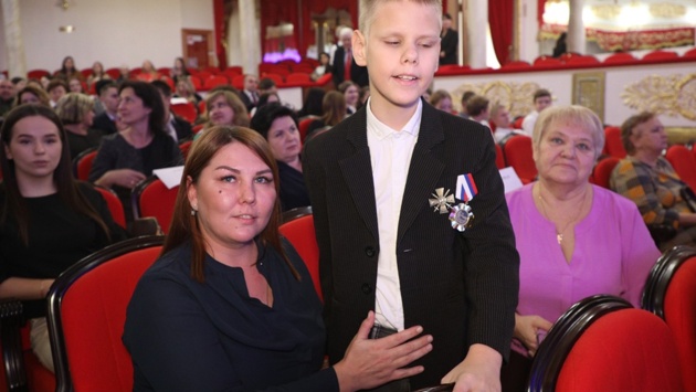 В номинации "Добровольчество" награду получил незрячий инвалид-подросток Вячеслав Дружинин. На сцену он поднялся в сопровождении мамы и бабушки, вместе с которыми собирал посылки для воинов.