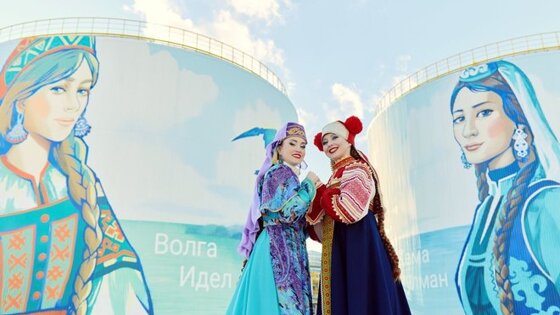 Один из крупнейших промышленных муралов: девушки в национальных костюмах украсили резервуары этиленника НКНХ