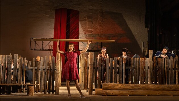 Первый раз «Деревянные кони» были поставлены на Таганке еще Юрием Любимовым 23 апреля 1974 года. Тогда спектакль пришлось пробивать с огромным трудом. Несмотря на то, что Федор Абрамов был лауреатом многочисленных премий, отдельными сценами пожертвовали. Тем не менее, спектакль был хитом театра. Сейчас никакой цензуры нет, но спектакль хитом, к сожалению не станет. Это при том, что поставлен он великолепно. Постановку осуществила одна из лучших современных режиссеров Москвы – Светлана Землякова. Именно она в прошлом году представила в театре Вахтангова великолепного «Генерала и его семью» . Придраться не к чему. Спектакль интересный, динамичный, с очень простыми декорациями. На сцене только большая крышка от колодца, которая, когда ее подсвечивают красным (или желтым) светом – символизирует солнце. Плюс два ряда частокола. Больше ничего. Но этого вполне хватило, чтобы четко передать атмосферу архангельской деревни. В спектакле Любимова играли Славина, Демидова, Бортник. В спектакле Земляковой звезд нет, но актеры сыграли ничуть не хуже. Прекрасно переданы характеры, образы. Смотрю – и верю, что передо мной настоящие деревенские жители. Смотрю на то, как одна из героинь прыгает со сцены в зал, идет по проходу, имитируя плаванье на спине, а за ней заезжий офицер пытается догнать ее, плавая по-собачьи – и верю, что в настоящий момент я действительно нахожусь где-нибудь на берегу северного озера и наблюдаю за резвящейся в воде влюбленной парочкой. Достоверность – абсолютная. Что логично – ничего другого я от Светланы Земляковой и не ожидал. Она – великолепный режиссер, умеющий мастерски передать атмосферу. Придраться не к чему. Но есть одно большое но. Тематика. В 60-е, 70-е годы тема русской советской деревни была безумно актуальна, что в литературе, что в театре, что в кино. Оно и логично. У тогдащнего поколения горожан (и театральных зрителей) была сильная связь с деревней. Если не они сами приехали оттуда, то их родители, на худой конец бабушки-дедушки – деревенские. Тема умирания деревни была близка, как никогда. А что сейчас? Связь города с деревней в Москве почти полностью разорвана. Я за последние 20 лет в настоящей деревне был один-единственный раз и провел там три дня. И я не одинок, таких много. В связи с этим отсутствие интереса к деревенской прозе. Кто нибудь из тех, кому меньше 50 лет, помнит писателя Федора Абрамова? Да нет, наверное. Для современного зрителя деревенская жизнь – это Герман Стерлигов с его хлебом по 1000 рублей за буханку, да и другие новоявленные фермеры с безбожными ценами, и шутливые ролики на ю-тубе о том, как городские жители пытаются корову подоить. В спектакле показан честный деревенский мир, но той самой реакции, которую от меня ждали – получено не будет. Первое действие – своего рода реквием по уходящей деревенской жизни. В частности, там рассказывается история одной жительницы деревни, которая отправила дочь на заработки, строго-настрого велела ей с мужиками ни-ни. Дочь ослушалась, забеременела, приехала домой, в избу побоялась зайти и повесилась за гумном. Судя по тому, как была поставлена эта сцена, я должен был поплакать, сочувствуя и матери, и дочери. Но никакого желания посочувствовать им не было. Я городской житель, и эта ситуация для меня – пик идиотизма. Одна совершила глупый поступок, что велела дочери х