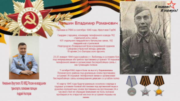В рамках акции в преддверии 79-й годовщины Победы советского народа в Великой Отечественной войне сотрудники органов внутренних дел из разных регионов России рассказали о своих родных - участниках Великой Отечественной войны. Сотрудники Восточно-Сибирского ЛУ МВД России на транспорте и подчиненных подразделений не остались в стороне. Начальник Иркутского ЛО МВД России на воздушном транспорте Андрей Нестеров рассказал о своем дедушке фронтовике Владимире Романовиче Лапшине. Председатель Совета ветеранов Управления Сергей Желнов рассказал об отце – Николай Миронович ушел в Красную Армию добровольцев в августе 2941-го. Старший референт ГИиОС Управления Нелли Коноплицкая рассказала о своем дедушке Анатолии Дорофеевиче Коноплицком и его подвиге на Курской дуге. Инспектор по делам несовершеннолетних Слюдянского ЛПП Анастасия Бабученко поделилась военной историей прадеда Шаповалова Владимира Стефановича. Референт ГГС, старший специалист группа морально-психологического обеспечения ЛО МВД России на станции Иркутск-пассажирский Ольга Бронникова поведала интересную историю знакомства под вражескими обстрелами своего деда Токарева Петра Константиновича и бабушки Токаревой (Котловой) Марии Николаевны. Начальник группы дознания Брасткого ЛО МВД России на транспорте Оксана Ведель поделилась историями подвигов дедушки Зырянова Ильи Афанасьевича. Заместитель начальника ЭКЦ Управления Евгений Губарь также рассказал о своем дедушке Артюхове Дмитрии Антоновиче, показал записи из наградного листа родного фронтовика. Заместитель начальника полиции (по ООП) Северобайкальского ЛО МВД России на транспорте Валерий Семенов поделился воспоминаниями о дедушке Андрее Хабудаевиче Саввинове. Заместитель начальника Тайшетского ЛО МВД России на транспорте – начальник ОРЛС Марина Ратничихина рассказала о дедушке Александре Романовиче Некрасовом, а сотрудник Улан-Удэнского ЛО МВД России на транспорте Баир Ринчинов – о бабушке герое Галсановой Дулме Галсановне.