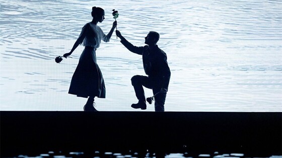 Немаленькая основная сцена Маяковки представляет из себя бассейн с водой, кажущейся совершенно черной. Глубина ниже колена, но есть и глубокие места – в них герои топятся. А еще плавают на бревнах (лес же все-таки), эффектно, с каскадом брызг, падают ниц, обливаются водой или просто в задумчивости по ней бродят – причем у женских персонажей, одетых более-менее по традициям конца позапрошлого века, длинные подолы неизменно мокры. (Говорят, достается брызг и зрителям партера; до амфитеатра не долетает). Вообще, сценическое пространство, не раз трансформирующееся во время трехчасового предстввления, обустроено разнообразно и броско (впечатляющая, заслуживающая быть отмеченной работа известного мастера Владимира Арефьева, с позапрошлого года ставшего и главным художником Маяковки). Понятно, откуда взялась вода: из диалога бедной воспитанницы Аксюши (Кира Насонова) с незадачливым возлюбленным Петром (Илья Никулин): "Аксюша И все мне вода представляется. Петр. Какая вода? Аксюша. Да вот что, милый ты мой, все меня в воду тянет. Петр. Ой, что ты, перестань! Аксюша. Гуляю по саду, а сама все на озеро поглядываю. Уж я нарочно подальше от него хожу, а так меня и тянет, хоть взглянуть; а увижу издали, вода-то между дерев мелькнет, — так меня вдруг точно сила какая ухватит, да так и несет к нему. Так бы с разбегу и бросилась". Ну вот, собственно, эта темная вода из ее обиженной души вылилась и разлилась по сцене. Да еще и лес, который, по Островскому, тоже малоприятное место. Так что негатив на негатив обеспечили трактовке Перегудова изрядную депрессивность. Здесь размышления Аксюши и Несчастливцева о тяге к самоубийству звучат выпукло и подробно. Положительных героев, пожалуй, нет и вовсе – тот подлец, этот выжига, помещица Гурмыжская (уверенно сыгранная Анной Ардовой) – вообще чудовище какое-то. Что представители "стороны оседлых", что персонажи со стороны "путешествующих", актеров Счастливцева (Сергей Удовик) и Несчастливцева (Вячеслав Ковалев) одинаково малоприятны. Ну, или слабы – несчастны, это уж как посмотреть. Счастливцев, натурально, предстает просто алкоголиком и фанфароном, вторая сторона его "двоемирия" (существование на сцене в роли аристократов и героев, искупающая никчемное бытие) совершенно затушевана. А уж когда в конце первого действия публика его символически закидывает гнилыми помидорами – совсем грустной кажется судьба актерская. Романтический пафос Островского – при всех недостатках актеры как люди искусства лучше, чем купцы, помещики, мещане – здесь как-то совсем теряется. Отчего перегудовский "Лес" приобретает черты некой экзистенциальной драмы, какого-то Стриндберга. Это, повторю, и эффектно, и красиво, но несколько странно. Ну и довершает дело финальное самоубийство Счастливцева, причем неясно, то ли от потери денег, то ли от белой горячки, то ли от мировой тоски… К слову сказать – со всеми "технологическими" аспектами спектакля дело отлично, но ближе к концу все же становится скучновато. Что, вообще, для этой живой, энергичной пьесы странно. Нельзя в связи с этим не отметить отдельных сцен, сделанных с эксцентрикой и энергией (прежде всего, сцены с деньгами) – но в целом покидаешь зал в грусти и печали. Вспоминаются "Леса" более-менее недавних дней – что серебренниковский в МХТ (с Дмитрием Назаровым, потом Сергеем Чонишвили 