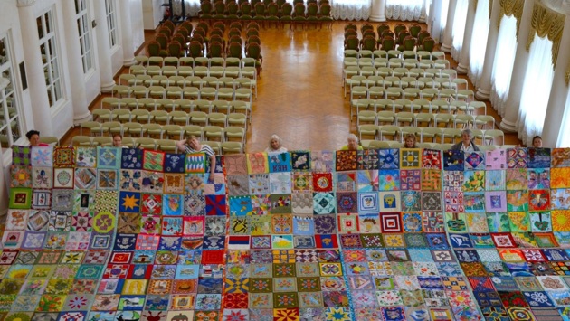 В проекте, который стартовал в начале февраля, приняли участие мастера из разных регионов России, они представили 270 блоков, выполненных из разных материалов, в разных техниках и цветовой гамме, по разной тематике. Все их соединили в огромное полотно размером 4 на 11 метров.
